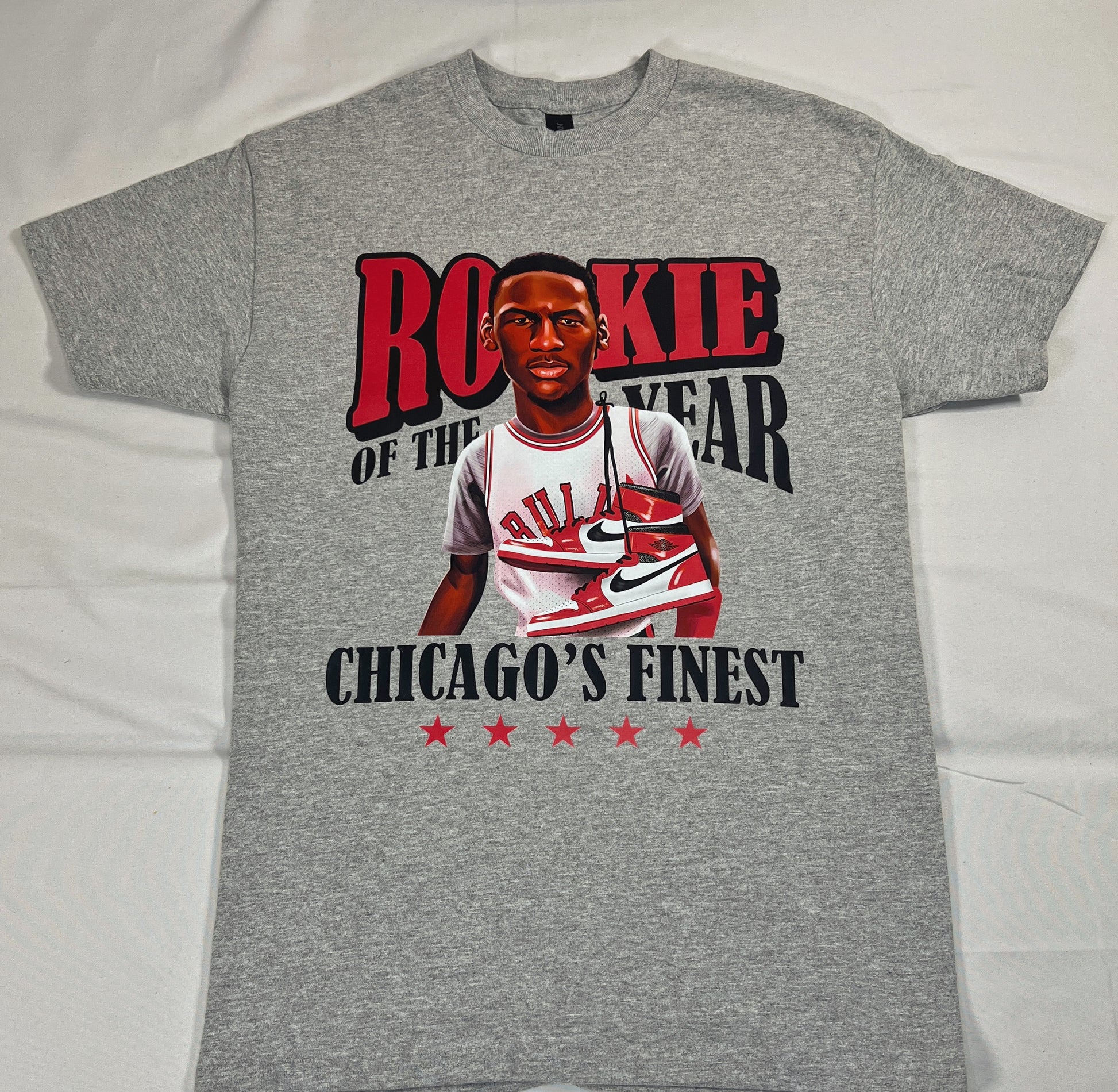 Celebrate legendary beginnings with this bold and stylish “Rookie of the Year” t-shirt. Featuring an illustrated portrait of a basketball player in a classic Chicago Bulls jersey, this tee is a tribute to greatness and hometown pride.